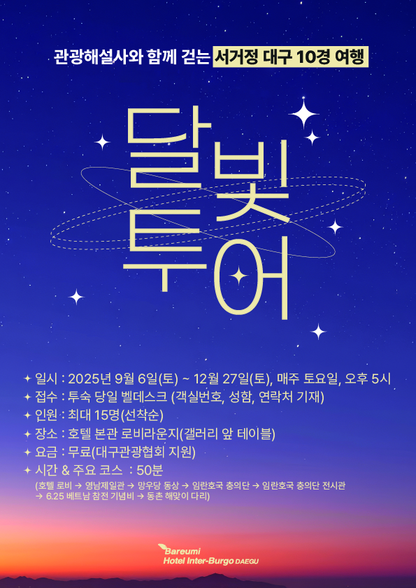 [투숙객 한정 무료 프로그램] 달빛 아래 펼쳐지는 특별한 시간여행 대구 관광 해설사와 함께 걷는 “달빛 스토리텔링 투어” 역사와 이야기가 깃든 길 위에서 낮과는 다른 대구의 매력을 만나보세요. 준비된 코스는 총 3가지이며 각기 다른 풍경과 이야기가 여러분을 기다립니다. * 2025년 9월 6일(토) ~ 12월 27일(토), 매주 토요일 * 오후 5시, 호텔 본관 로비라운지 갤러리 앞 테이블에서 출발 * 투숙 당일 벨데스크에서 접수 가능(객실 번호, 성함, 연락처 기재) * 최대 15명(선착순 모집) * 소요시간 약 50분 ------------------------------------------------------------------------------------------------------------------------------------ *코스 안내* 인터불고 호텔 로비 - 영남제일관 - 망우당 동상 - 임란호국 충의단 - 임란호국 충의단 전시관 - 6.25 베트남 참전 기념비 - 동촌 해맞이 다리